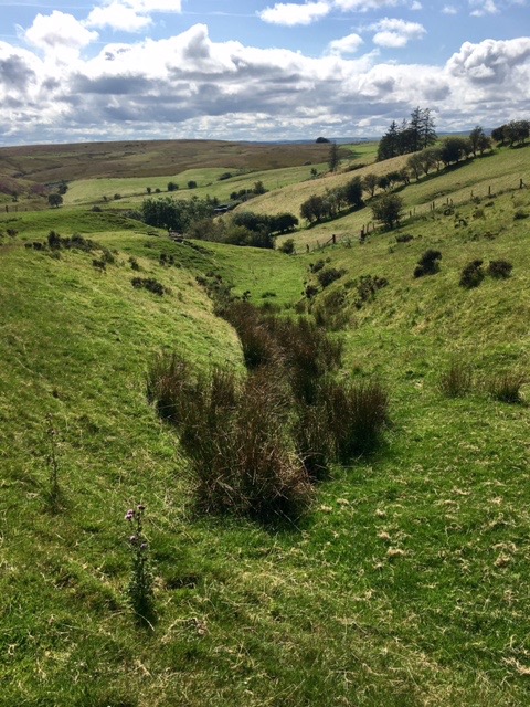 Leaving Newtown proved not to be as simple as I thought it would be. To the east of the town a huge scar has been cut into fields as they create a bypass that will deter travellers from entering the town and thus killing it further. The scar cut right across our path and required us to take a detour. Having negotiated the roadworks, we continued to climb out of the valley on ambiguous paths overgrown with nettles, thistles and brambles. The rucksack, despite its weight was comfortable on my back and only became cumbersome when we had to climb over a barbed wire fence with low horned branches above.