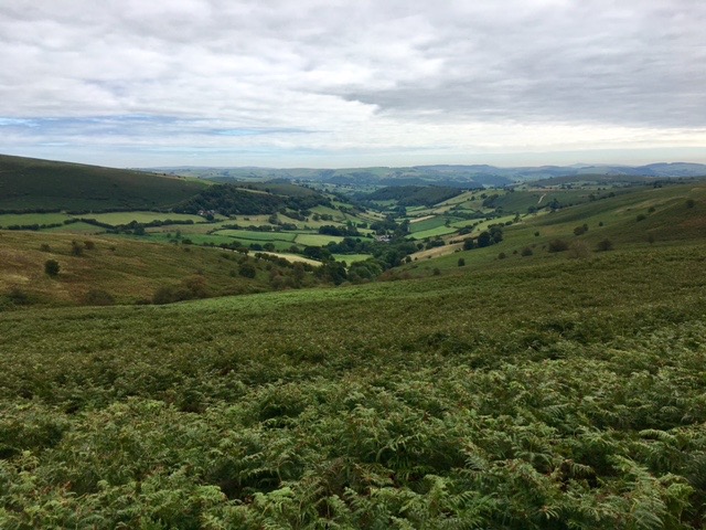 We had a choice of two routes – a shorter valley based route that incorporated quite a lot of road walking or a longer, high level route that would give us far-reaching vistas. We chose the latter, so, well before 8.00am we were climbing quite steeply up from Brandy House Farm on Glyndwr’s Way and over wide open moorland. There was not a breath of wind and the nearby wind farm stood motionless. The hills were deserted apart from wild horses roaming the upper slopes, looking for grass among the heather and bracken. The day was just perfect. We only saw three people all day.