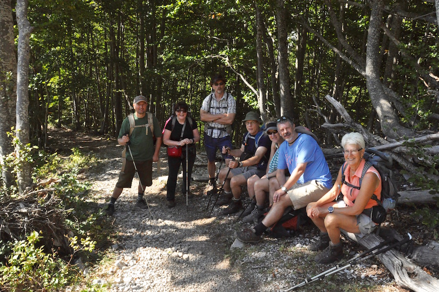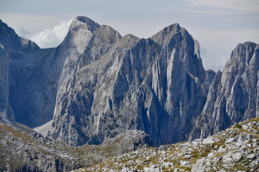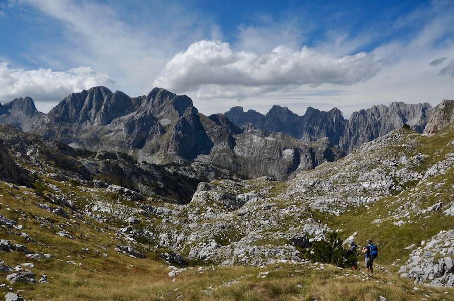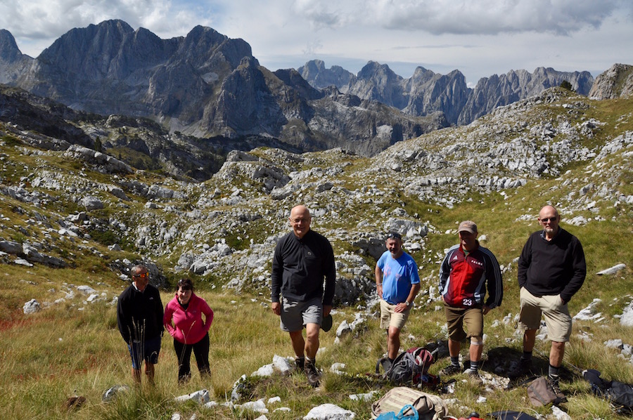 Three members of the group decided not to go higher, so while the rest of us continued upward, they began the descent. We were now on open, alpine hillsides, level with many of the craggy peaks we had gazed up at from the valley bottom. They were stunning. But, however stunning they were, we were not prepared for the view when we reached the top of the pass at a little over 2000m. As we reached its crest we were faced with a mass of spectacular rock faces and craggy peaks. It was a stunning view, impossible to turn away from. We were looking into a little corner of Montenegro with the furthest wall of mountains on the other side of the valley again being the border with Albania as it swept round in a huge arc. We were so lucky that the weather and conditions were perfect for us to enjoy such a vista.