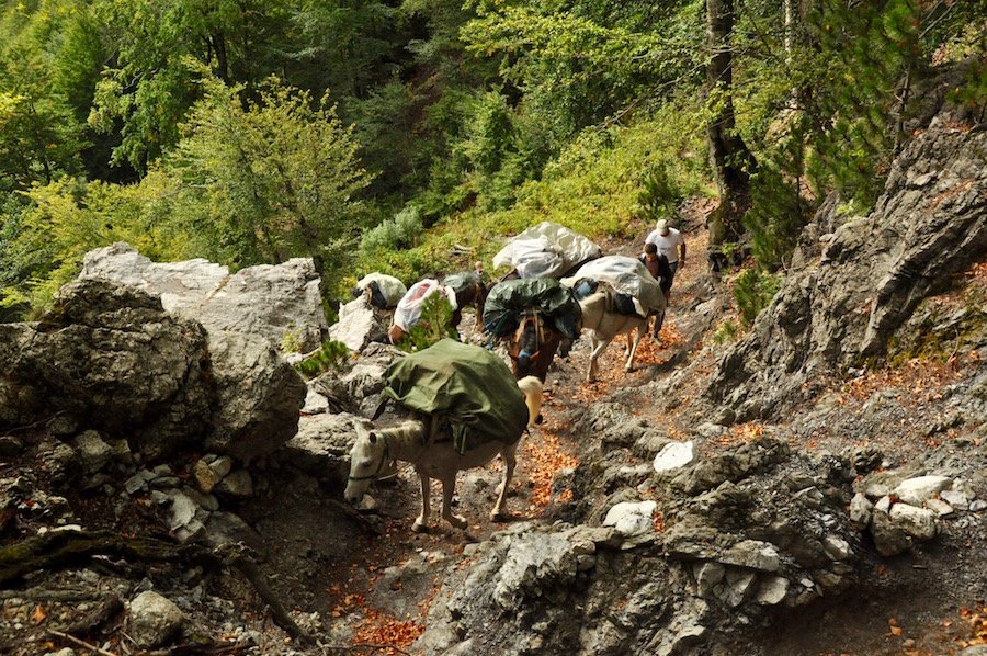 After another disappointing breakfast a local minibus took us up to the trail head, saving us about ninety minutes of road and river bed walking. There we met our mule team that were going to carry our kit over the pass to Thethi. It was still damp and it was necessary to don waterproofs, but after a while of steep climbing through woodland, the rain eased and it became far too hot to keep the waterproofs on. Fortunately, those who had been off colour the day before had made a remarkable recovery, and although Fraser was still a little delicate, he was able to cope with the walk.