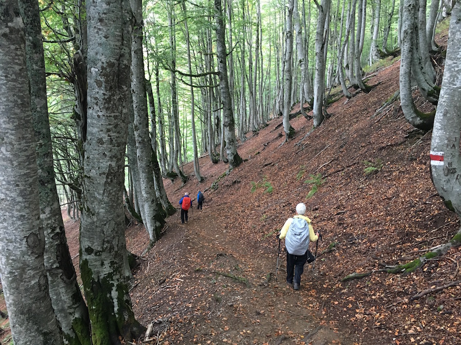 Unlike the Valbona side of the pass, the Thethi side was forested almost to the top. The descent took us into an amazing area of beech forest on a steep slope. All the trees had a bizarre bend in the trunk just above ground level. I can only assume that the young trees initially grew at right angles to the slope but in their quest for light turned to the vertical. Walking through this beech forest it was hard to imagine that we were in Albania; we could so easily have been back home – beech trees, rain, temperate environment. It really was beautiful walking. It did not have the wow factor of the day before but we were all very privileged to be able to walk in such beautiful surroundings.