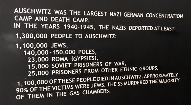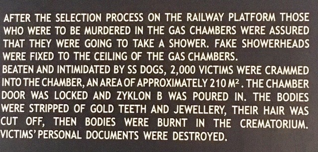 When the Germans had the Jews, and other undesirable sections of society brought here by the train load, they had everything taken from them, their cases, shoes, brushes, pots and pans, glasses, even artificial limbs. Huge piles of these artefacts were displayed in some of the barracks. Seeing these we began to understand the scale of what went on here and specific notices on some of the walls put it into numbers. In total 1.3 million Jews from across Nazi occupied Europe, Polish political prisoners, Roma gypsies, Russian prisoners of war and other ethnic minorities were transported to Auschwitz between 1940 and 1945. About 1.1 million were murdered. It is an unimaginable figure.