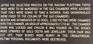 As we visited the huts where those spared the gas chamber lived, I couldn’t help feel that those who failed to make the grade for labour might have had the better deal. Their agony was soon over, while those that were forced to work in the most appalling conditions, also lived in the most appalling conditions until the effects of hard labour, starvation and poor sanitary and living conditions killed them. If that did not happen, they would just have easily been sent to the gas chamber once their usefulness ceased.