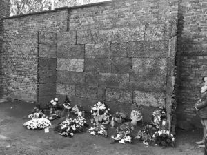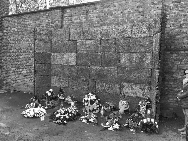 The condemned prisoners had to strip naked in block 11, on the ground floor. Any women among them disrobed in separate rooms. The women were then led into the courtyard and shot first. The condemned prisoners were led to the wall in pairs. The SS executioner walked up from behind and shot them in the back of the head with a small-caliber rifle. Designated prisoners threw the corpses onto trucks or carts that delivered them to the crematoria. Many of the people killed in this way were never entered in the camp records. Anna told us that the youngest to die in this way was a nine year old girl.