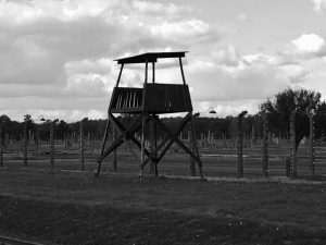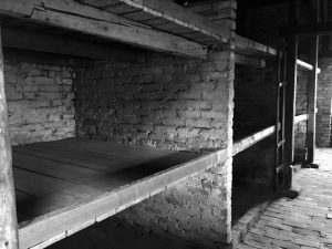 We paused at the entrance, under the sign, “Arbeit Macht Frei” “Work Sets You Free”. It was a chilling place for us who knew what lay beyond the gate but for the many who came here, initially, might have had some hope. On either side of the gate impenetrable double fences of vicious, electrified barbed wire spread around the whole camp. Every so often a guard house towered above the fence, making it impossible to escape undetected. Beyond, in geometric precision, brick barracks stood, stark and uninviting. Before the war, this had been a Polish military barracks, saving the Germans the necessity to start the camp from scratch.