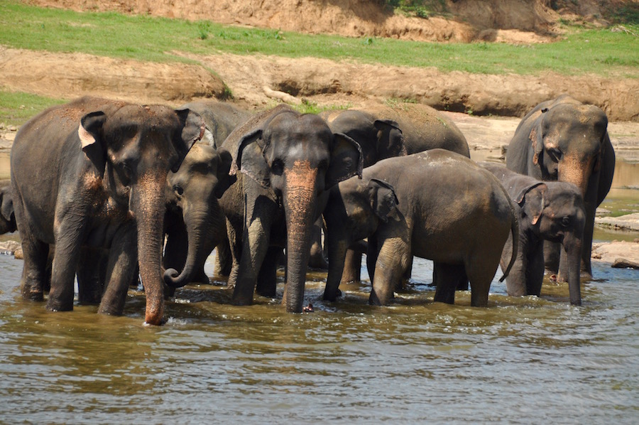 By the time we arrived at Pinewella the elephants were already bathing in the river, so we headed down to watch the spectacle. There was not a lot of water in the river but to compensate there is a fire hose, which sprays water in an arc over the assembled elephants. It is a spectacle but I feel slightly uncomfortable watching it; it is almost turning the elephants into performing circus animals. You have to remind yourself that if Pinewella was not there, then these fifty or so elephants being looked after would all probably be dead, and the money we pay to experience the spectacle helps ensure they have a good a life as possible.