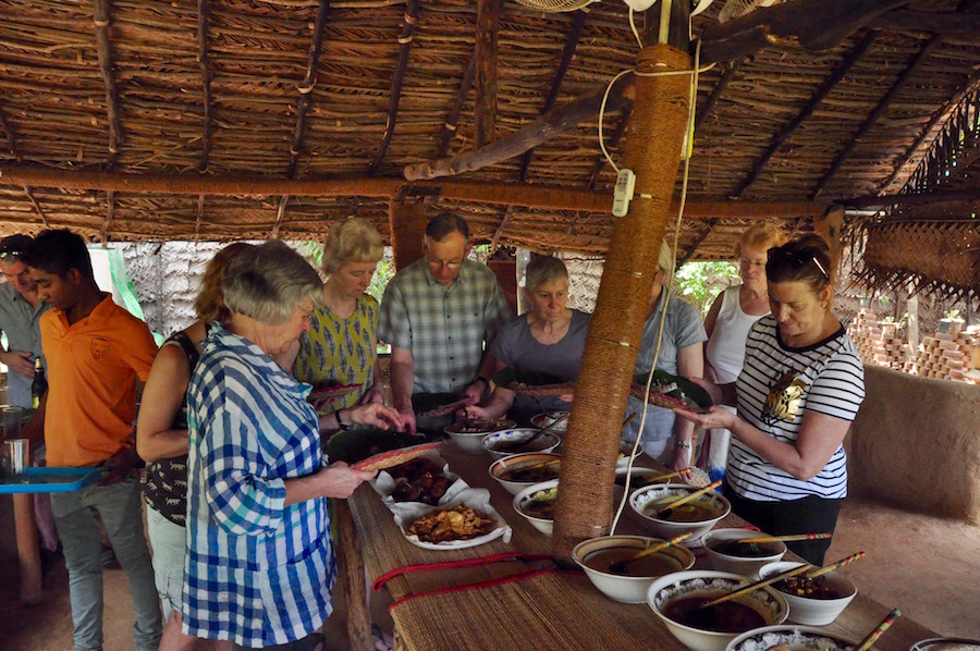 That was lunch. I am not going to write about all of the meals we had but this one was a bit special. We were on our way to Polonnaruwa, the ancient capital of Sri Lanka. En route we called into a traditional home that produces traditional lunches for passing travellers. This must, by now, be a well known place because there was a constant stream of visitors, like ourselves. Sitting under an open sided thatched shelter, our food was immediately brought to a central table. It included fish and chicken but with bowl after bowl of accompaniments so that our banana leaf plates were straining under such fine food and, of course, we had to try everything.