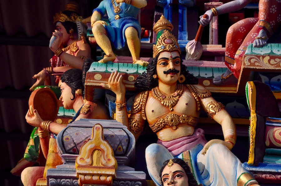 After some beach time we returned to our hotel, more relaxation before heading to the Hindu temple of Konesvaram, built on a rocky outcrop just to the north of Trincomalee. When the Portuguese took control of Sri Lanka in the 16th Century they destroyed many of the temples and Buddhist icons in their search for treasure. This happened at Konesvaram where they threw the whole temple over the cliffs and into the sea, as they dismantled it in their search. The present temple was rebuilt post Portuguese, during the occupation of the the Dutch. The temple is similar to those found in southern India with towers full of story telling characters in pastel shades and rather gaudy statues with frightening personas and a tendency to be blue. While we were there we were able to mingle among the devotees and experience at close hand some of their rituals. Whilst I find it all very interesting and admire their faith, I must confess to understanding very little.