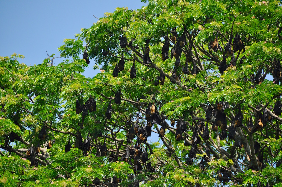At Sanath’s suggestion we went to the Botanical Gardens in Kandy to await news. These are beautifully laid out gardens with lots of exotic plants and trees, massive bamboos, Mimosa in full bloom (for a while I called the Samosa!) Along the river’s edge were some tall trees absolutely covered in hanging bats, the same bats I had seen the previous evening as they ventured out on their nightly search for food. There were so many of them that some of the branches were straining under their weight. As they sleep, they are not silent. Nor are they still, as they stretch and occasionally fly off to return a few moments later.