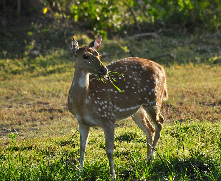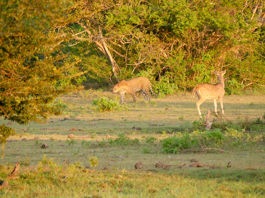 Towards the end of our safari we came across some deer grazing. Suddenly they looked up as one, all facing the same direction, stood stock still and watched. They are always a pretty good indicator of what we really wanted to see, a leopard. We were lucky, for strolling among the bushes was a leopard, not necessarily stalking the deer but perhaps keeping them on their toes. No sooner did we see it that it disappeared again and no photographs could be taken. But, at least we had seen one. There are only twenty five in the vastness of Yala National Park and we had managed to see one of these very elusive cats.