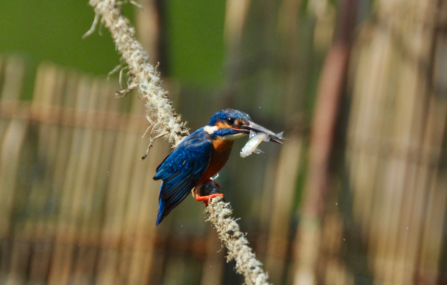 I was pleased, then, on our last day, when Sanath wanted to take us on a river safari. Here, a boat, with a sometimes smelly outboard motor, took us through the mangroves, which act as fish nurseries, where the fry can grow in relative safety before they head out into open water. On the narrower stretches there a fish traps set by fishermen. It was on one of these that we met the best fisher of all, a beautiful kingfisher. It sat on a pole with its beady eyes firmly fixed on the water below. In a flash it dived into the water to emerge with a fish between its beak. It perched just next to us on a rope, holding the fish, then with a flailing of its wings and a jerk of it head, the fish was gone. It was such a treat to witness this at close quarters.