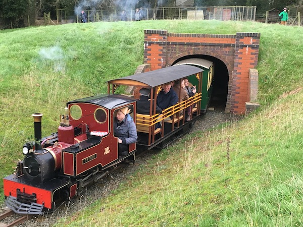 IMG_1564On Boxing Day Michael and Helen Whitehouse hosted a “steam-up” at their home in the beautiful Worcestershire countryside. This is an annual event, which I always look forward to, and is one of the highlights of Christmas.  It is aways in aid of charity and this year it was in aid of the Himalayan Trust UK. People arrive to park their cars in the lane below the paddock adjoining the Whitehouse garden. Passing through the gate into the field you wait on the station for the train to collect you to take you on a circuitous route with many recognizable railway features, even if they are scaled down, up to the house where there is another station. There we are provided with mulled wine, coffee and delicious mince pies and the chance to meet with people whom you last met at the same occasion a year ago.