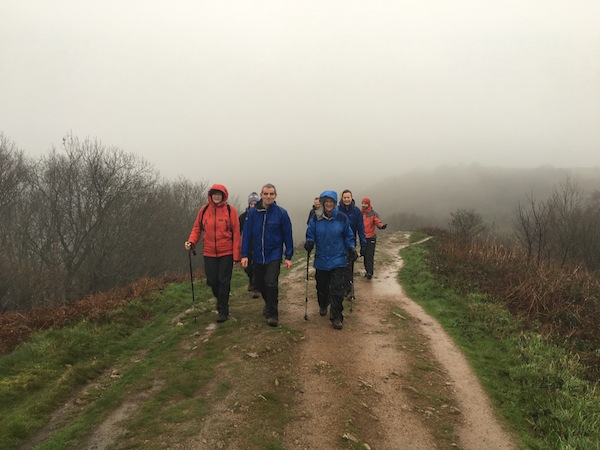 IMG_1571A hardy bunch met me at the car park, including Libby, not dressed for walking but wanting to know what time we would be finishing so she and Ellie could meet us in the bar of the Malvern Hills Hotel afterwards. There were eight of us brave enough, or stupid enough to venture out. I decided that we would curtail the walk to last a couple of hours or so, so that we would know we had been for a walk. Once we got going it was not too bad, a little exposed on the tops but on the west side, out of the wind, it was quite pleasant, sufficiently so that we added an extra few minutes to the walk by visiting the obelisk. The hills were sodden with so much recent rain it was mucky underfoot. There were no views from on high as we had our heads in the cloud. But the company was good and all those that languished in bed do not know what they missed.