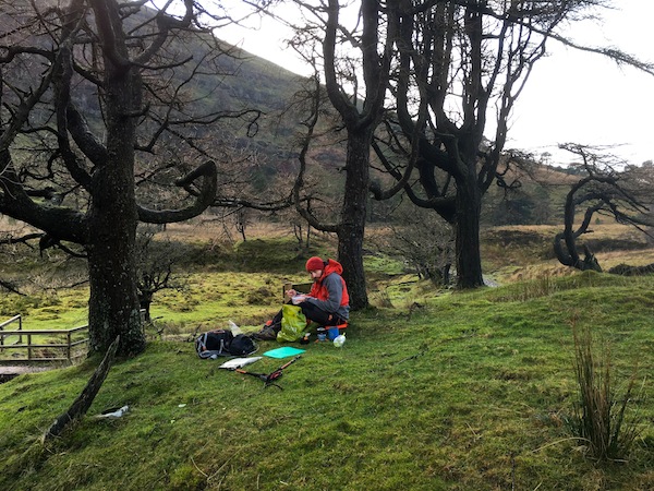 Swinging round we stopped for lunch on a small mound between the junction of two streams. Three trees grew from it. It was just in the shade but, because it was a mound it was relatively dry compared with the ground that surrounded it. It was an ideal opportunity to try out a couple of new pieces of kit, a steripen for water purification and a fast acting compact stove. Taking water from the stream, we purified it and then boiled it up to make cups of mushroom soup, which, if we were honest, was pretty tasteless. I forgot to pack a spoon so most of the powder stuck to the bottom and did not dissolve, so I might be doing the soup a bit of an injustice.