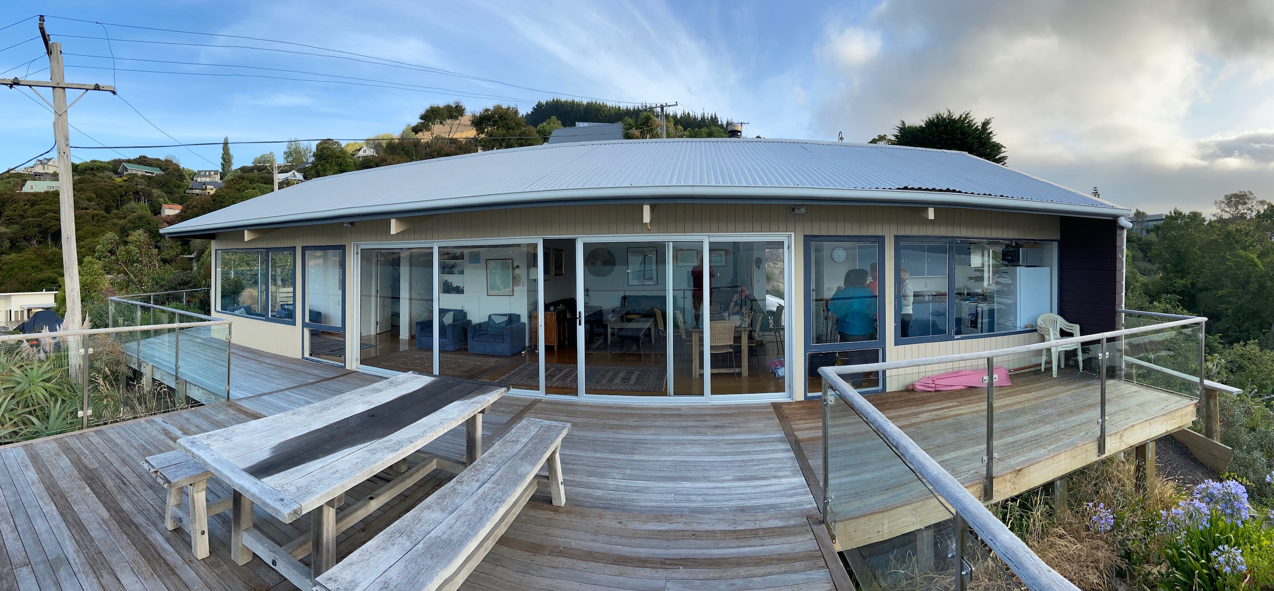 Dropping down into the small waterside town of Akaroa we looked for our house for the next couple of nights. Harbour View House was a short distance out of the centre of town, in an elevated position overlooking the water. The single storey building had a completely glass wall looking out at the view. There was also an extensive deck, allowing you to soak up the view wherever you were in the house. It was stunning! With such a stunning view, we decided to eat in and enjoy it for as long as we could.