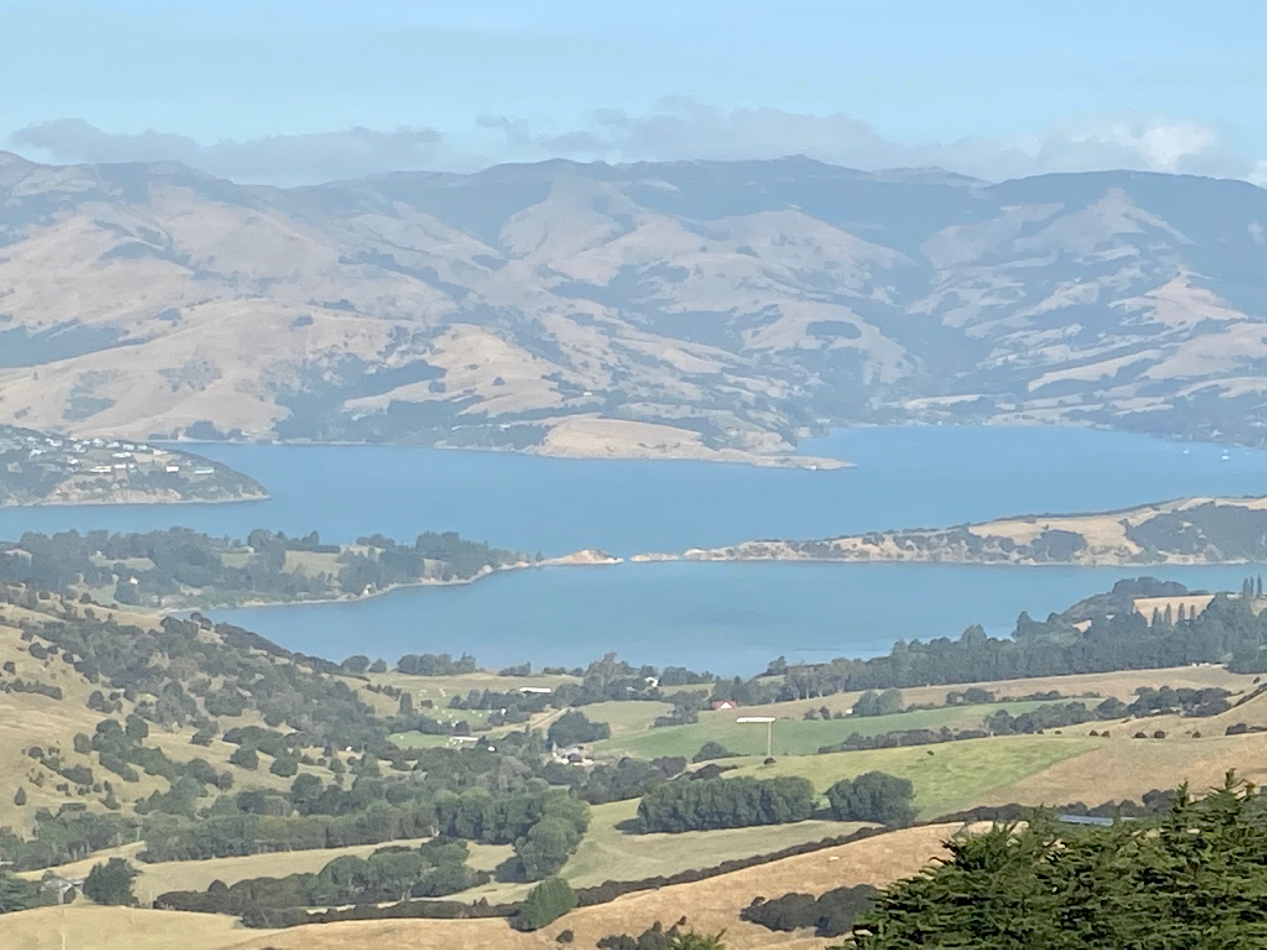 Feeling more optimistic about Christchurch, we headed off to Akaroa, a small town on the Banks Peninsula. The Banks Peninsula is formed from an ancient volcano that rose out of the sea just off the coast of the mainland. In the intervening years, through sedimentation, it has become part of the mainland. Having crossed the flat area around Lake Ellesmere, we began to climb steeply up to the rim of the old crater. From the top you look down into the old crater. At some point, the crater was breached by the sea and now there is an enormous haven of safe water surrounded by steep slopes rising up to the rim of the crater in an arc.