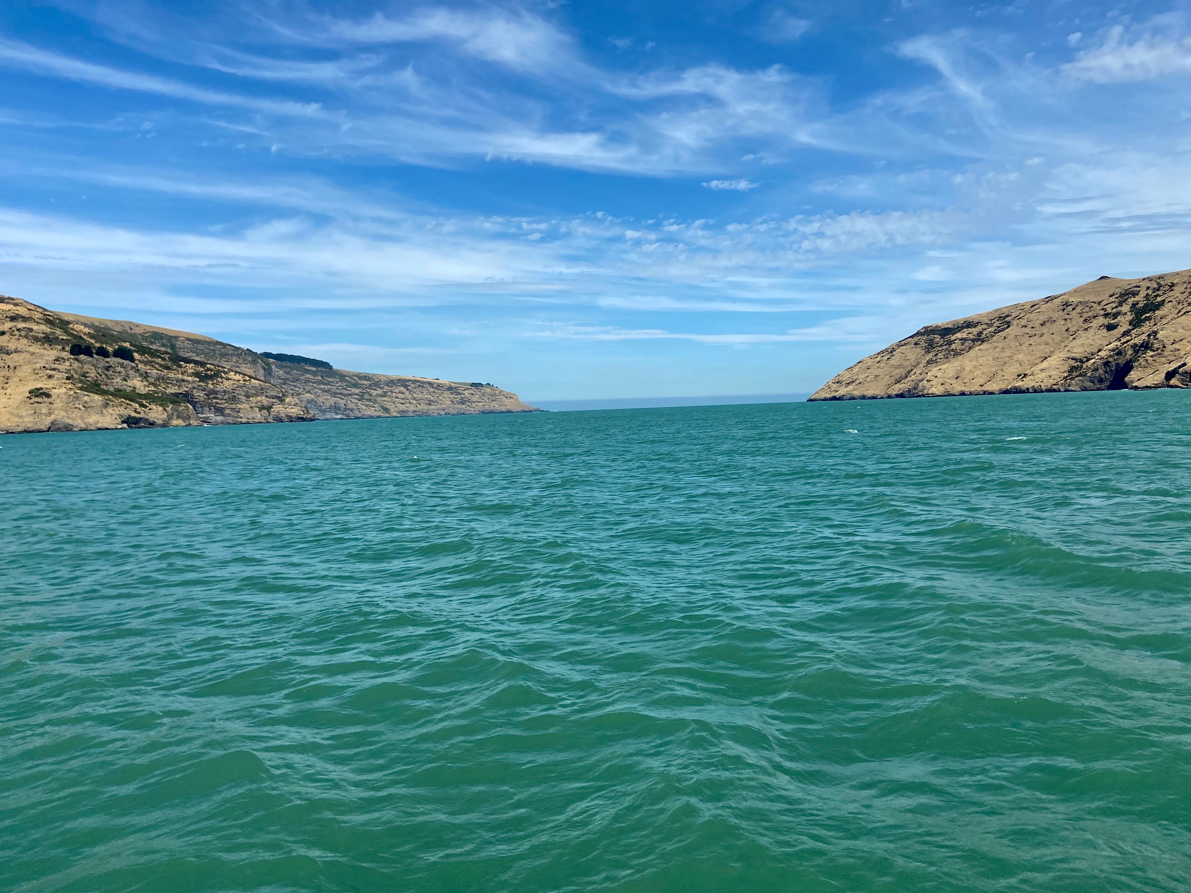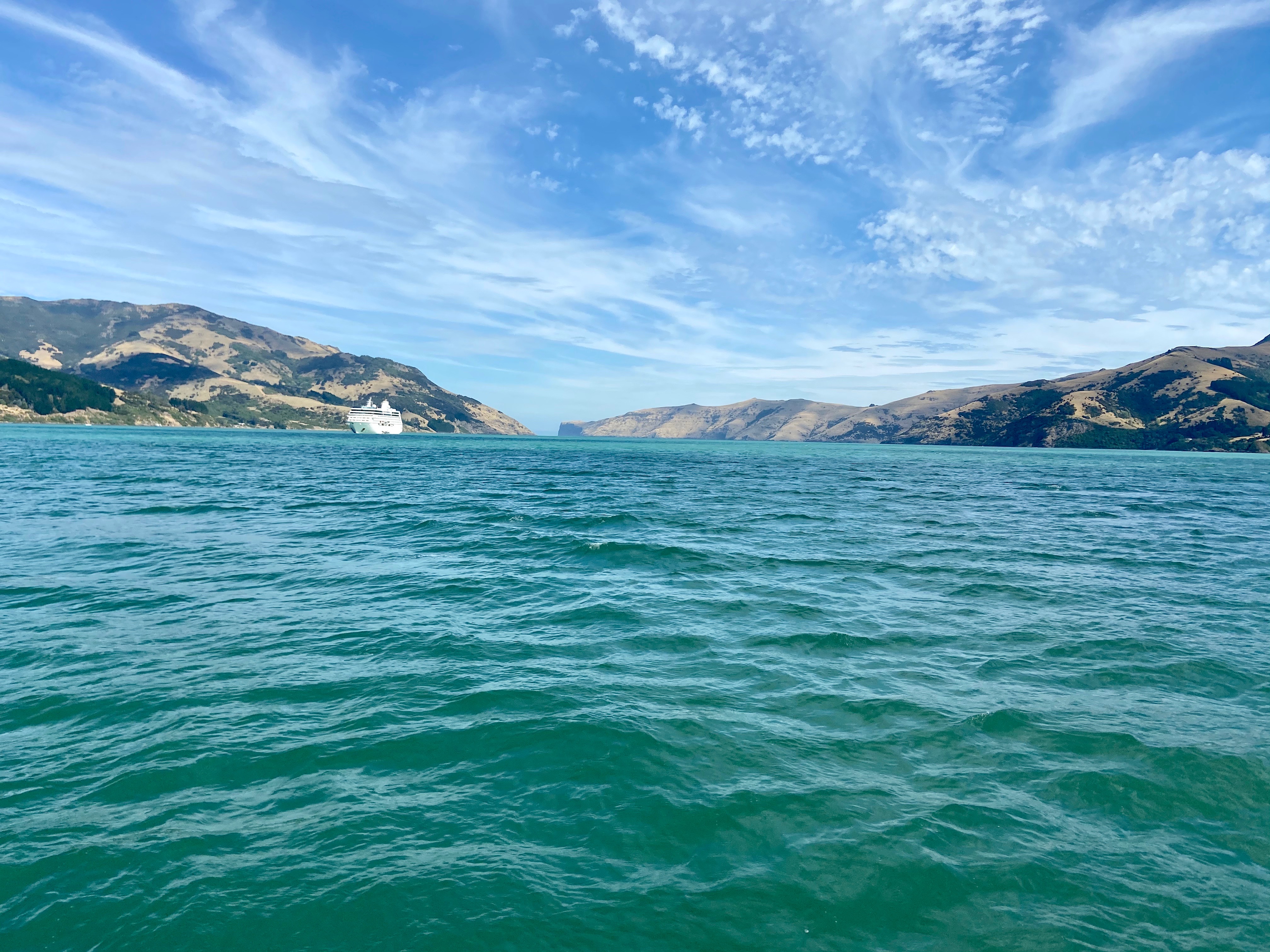 Our cruise was very relaxed. There were very few people on the boat and the late afternoon sun was brilliant. As we pulled further away from Akaroa, we could see a cruise ship anchored. That explained why small boats were going back and forth all morning, ferrying passengers from ship to shore and back. The route took us around the northern edge of the inlet before heading out towards the open sea, some 15km to the south. Every-so-often we would be given snippets of information about the history of the area, all the time looking out for dolphin.