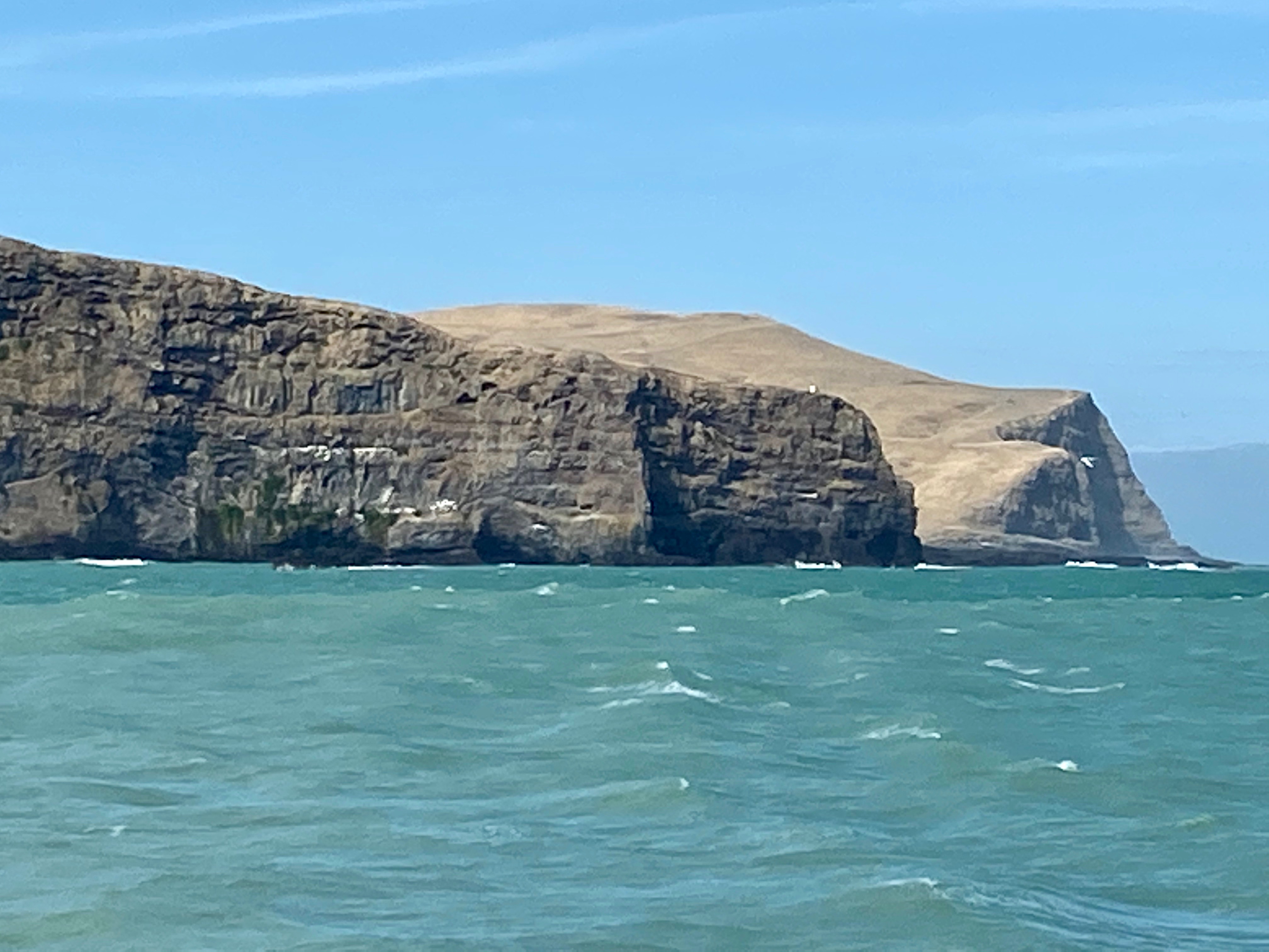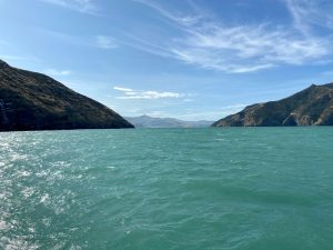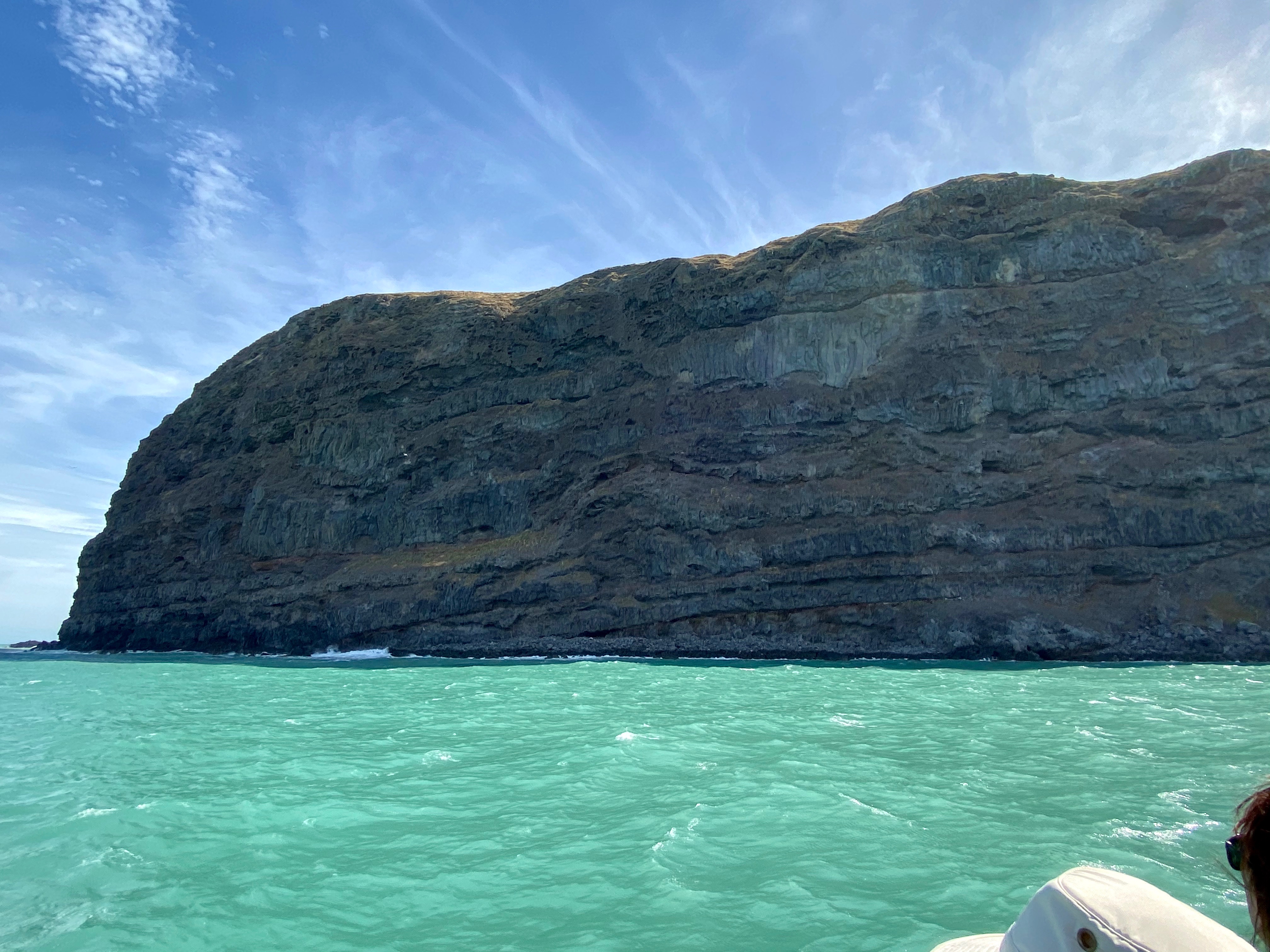 As we neared the open sea the swell became more noticeable. We hugged the shore where we were able to see lots of seabirds on the cliffs and a blue penguin on the water. We crossed the inlet, across the swell, to the other shore and began to head back to Akaroa. As we did so the cruise liner was leaving.