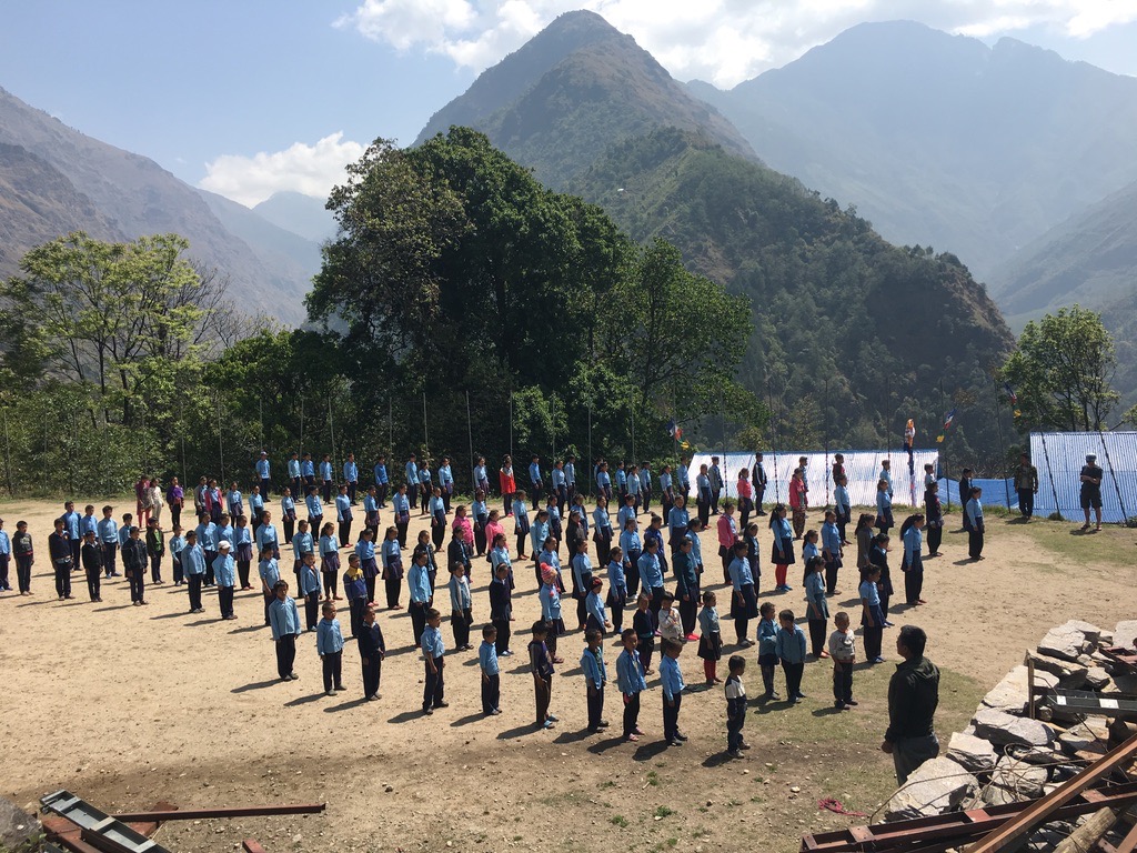 At 10.00 the oxygen cylinder chimed the start of school and the children lined up on the playground, positioning themselves an arm’s length of each other front and back. A speaker sprang into life and the children sang the Nepali National Anthem. A number of children were then selected to lead the brain gym, also set to music. Brain gym is a series of movements that mark the transition between free play and focused learning. When that was over a couple of older boys were called out to the front to remind us all about the importance of education.