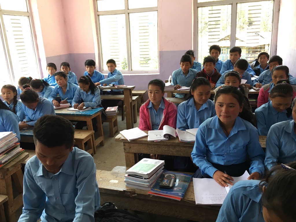 Once the classes were up and running we split up and visited each in turn. We observed an English class, two geometry classes, a social studies class discussing development, a class learning a new class song, a Nepali class and a class of younger children learning their English letter sounds and using them in simple words. Most of the teachers were animated and enthused the children. The children may have been subdued a little by our presence.