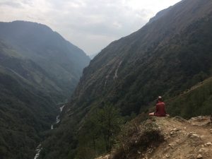 I started quite well, the paracetamol having taken effect. I set the pace which suited me and knew would benefit the majority of the group. Jonathan is supremely fit and likes to race on ahead occasionally. The route up the valley towards Ghunsa is not easy. It is very undulating, crosses some difficult terrain where landslides had occurred during and since the earthquake. The noise from the river was deafening as the torrent raced and tumbled over a chaotic array of rocks, some the size of a house. It really was spectacular.