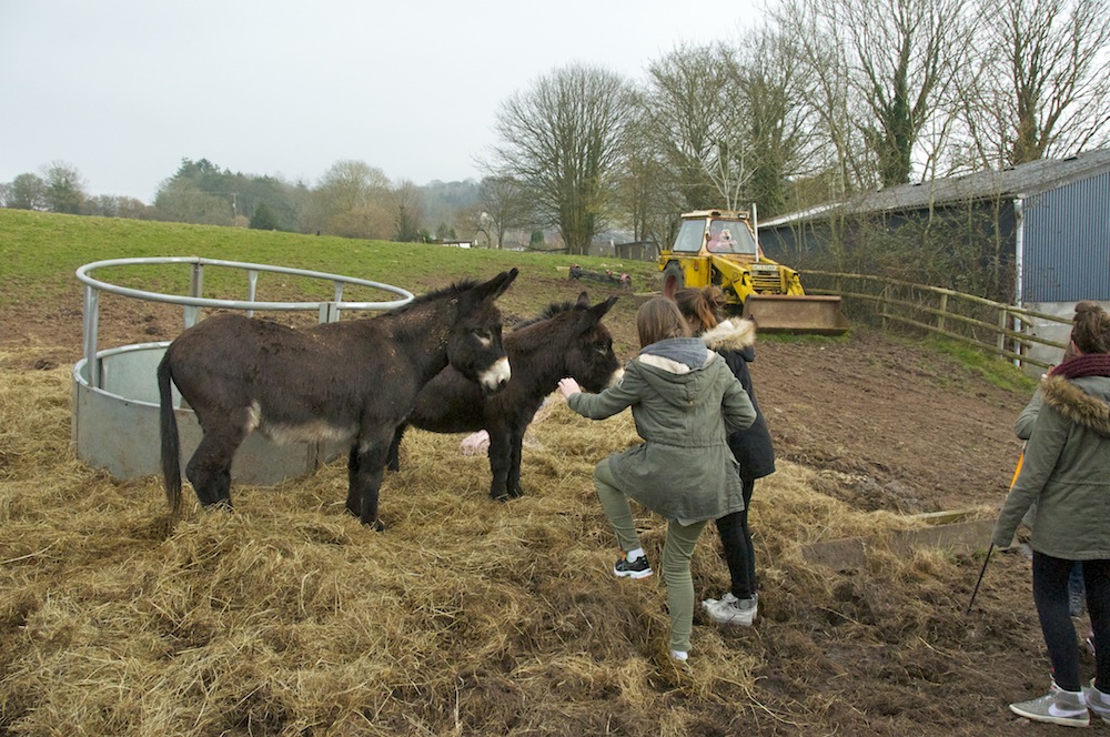 Once on the hillside, the students could choose their pace, some wanting to forge ahead, while others less able or used to walking gently brought up the rear. We had plenty of stops in order to keep the group relatively together, the first giving them an opportunity to pet the two donkeys that eagerly craved their attention. Unfortunately, the Highland cattle and the enormous, but very docile English Longhorn cattle, that usually abide in this field, were not around to add to the spectacle.