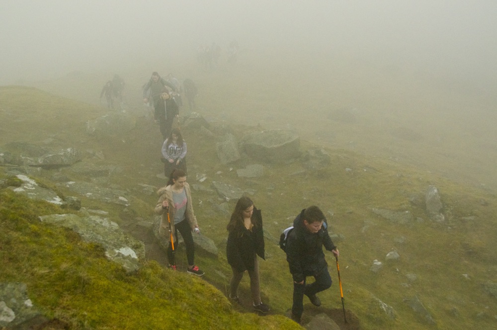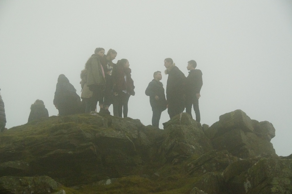 Eventually, everybody reached the summit. Last time we had stunning views of the surrounding hills and mountains. Today we saw nothing. One student remarked, “Have we come all this way for this?” It didn’t stop him from taking a photo of the mist. We were able to spend a lot more time on the summit, for despite the mist it was a lot warmer, and had been all the way up the hill. And the rain had held off.