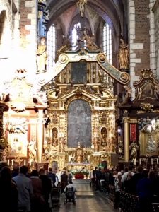 Our last day in Krakow, we decided to explore on foot. We wanted to look at some of the churches and also to visit the cathedral within the castle. We visited numerous churches. I am never sure whether photographs are allowable. They are certainly not allowed in the most spectacular of church interiors, St. Mary’s on the edge of the square. It is magnificent. The altars in all of the churches are huge, and numerous, extremely ornate and mesmerising. The detail in them is astonishing. I am not used to such ornate and elaborate centre pieces and I found myself sitting and looking at them for long spells.