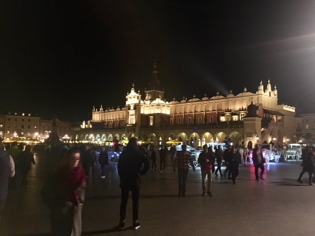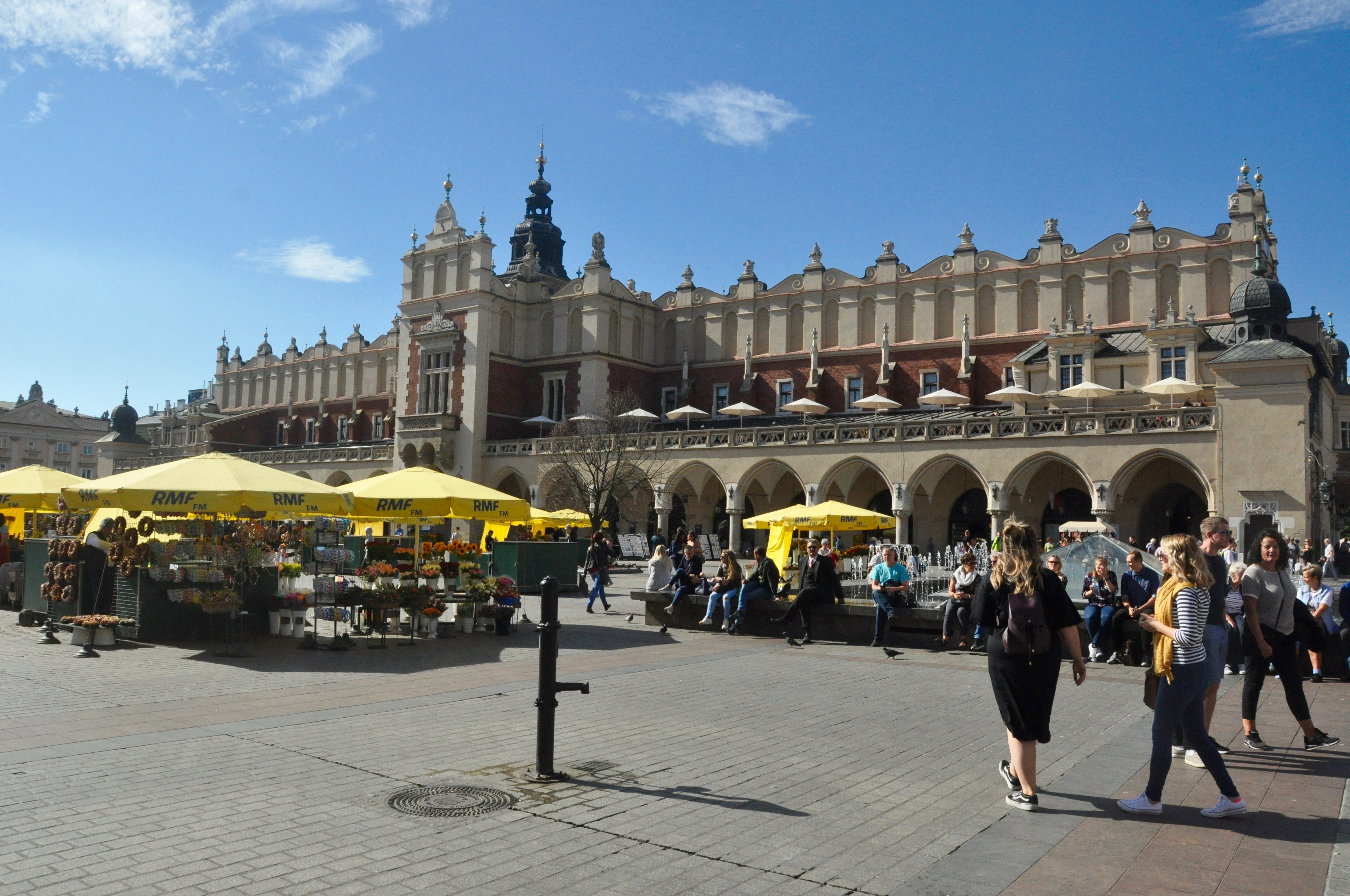 I had arranged for transport to take us all into town and the Kossak Hotel. It was a bright, sunny and warm morning. Predictably, the hotel had not prepared our rooms so we headed off to the magnificent square in the centre of town for an early lunch. At 200 x 200 square metres it is the largest medieval square in Europe. It really is beautiful, with elegant buildings all around it. In front of the majority were umbrellas and tables bringing the restaurants out into the square. In the centre, almost dissecting the square in half is the Cloth Hall, now a multitude of colourful stalls focusing mainly on souvenirs and jewellery.