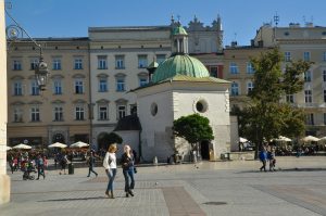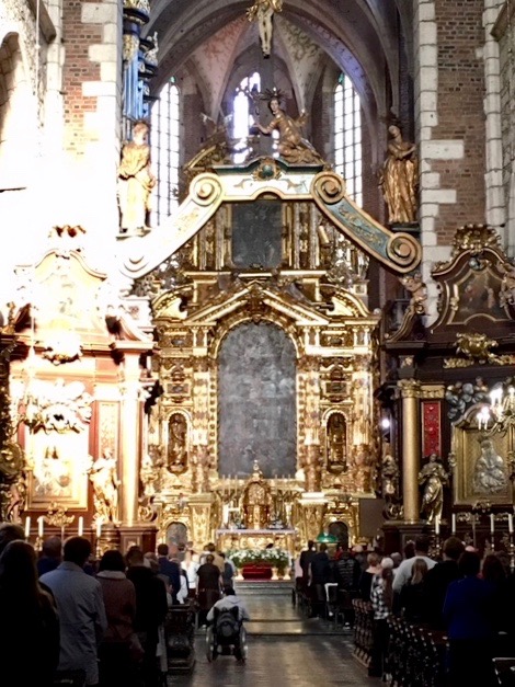 There was too much to see and take in in one go, but we did make time to visit the small church of St Adalbert’s, standing alone in one corner, at an angle, breaking up the symmetry of the buildings around the perimeter. The reason why it stands out is that it was built in the 11thC, which means it pre-dates the square. It is a mix of pre-Roman, Roman, Gothic, Renaissance and Baroque architecture. As soon as you walk in you can tell it is old. You drop down two metres as the floor level is that much lower than the rest of the square.