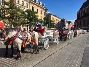 Choosing to have our last lunch in Krakow on the square, yet again, we chose a front row table looking out on to the area where the horse and carriages park, touting for business. I found this a fascinating spectacle. Each pair or ornately decorated horses and gleaming white carriage is cared for by a very smartly outfitted, often very attractive, woman. While parked in line, they talk to passers by trying to lure them into their carriage for what is actually quite an expensive ride. Obviously, the more people you can get into a carriage the more cost effective it becomes.