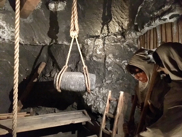 Once we were in, the descent into the mine was impressive; no cage lowering us into the depths, but a wooden staircase. Looking down over the handrail from near the top, we could not see the bottom. It seemed to go on forever. Going down, constantly turning left down the flights of stairs made you feel quite giddy at times. Eventually, we reached the point where we left the stairs to enter a tunnel. This was lined with interlocking tree trunks that supported both the walls and the ceilings. The amount of timber we saw underground during the tour was phenomenal, but then Poland has a lot of woodland. Much of the tour was spent walking along many of these tunnels with not a lot of visual interest. Our guide was talking into a microphone and we were listening with a headset. In the confines of tunnels it meant that unless you were standing close to her it was difficult to see what she was talking about.