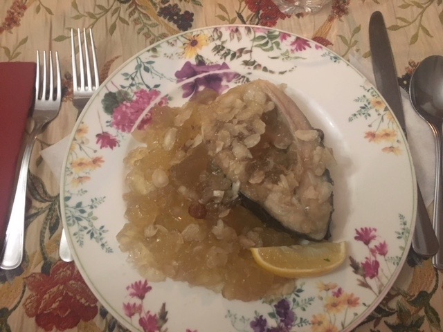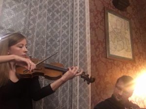 However, the highlight of the evening was not the food but the concert that took place just over my right shoulder. A trio of young people, a double base player, an accordionist and a violinist played two sets while we ate. They were superb and the girl playing the violin knew how to make her instrument sing. I realised, watching her, why I never got the same effect when I played the violin as a child. I didn’t move my body in rhythm with the music. I stood stock still in a state of intense concentration. She was so relaxed it was beautiful to both watch and listen.