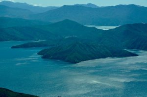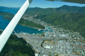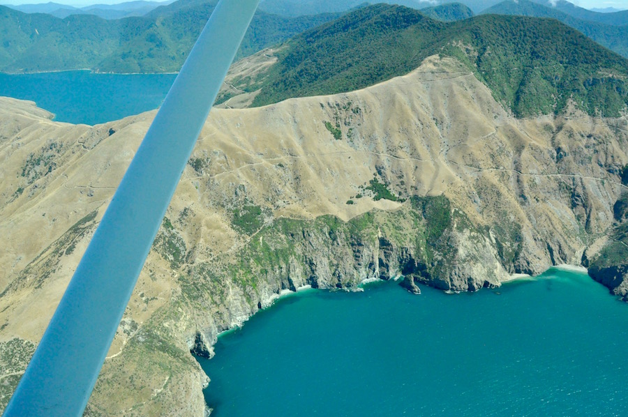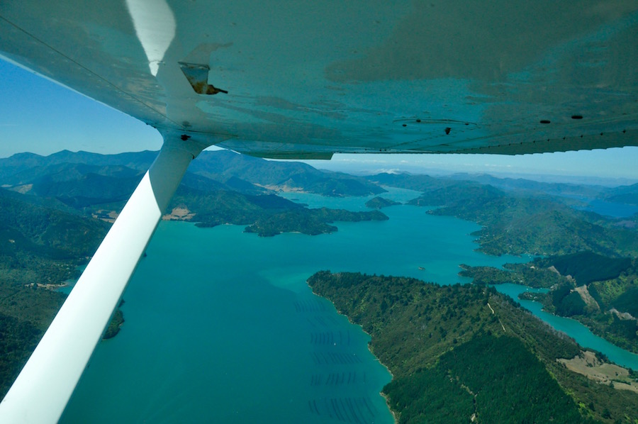 From the outer edges of the sounds we had fantastic clear views and a long way to the north we could make out the distinctive shape of Mt. Taranaki half way up North Island’s west coast. We had now reached the limit of our flight, so we headed back towards Picton, revelling in the fabulous views of the sounds below.
