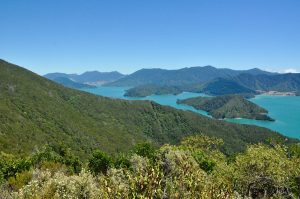 Paperwork done, we climbed aboard our Cessna 172, with me taking the co-pilot’s seat while Tina and Paul took the two rear seats. Flying north, we flew over Picton and over the still, blue waters of Queen Charlotte Sound. We had told our pilot that we were going to be walking the Queen Charlotte Track, so he took us to overlook places where we would be walking. Flying over the first ridge we were taken over Kenepuru Sound. Here, the water was a lighter, greener shade of blue because it is not as deep as the Queen Charlotte Sound and the water is less exposed to ocean influences. Then we flew over Pelorus Sound and out to the islands on the outer edge of the sounds. Until we reached those outer edges, the hills were heavily wooded down to the water’s edge, whilst the islands tended to be treeless.