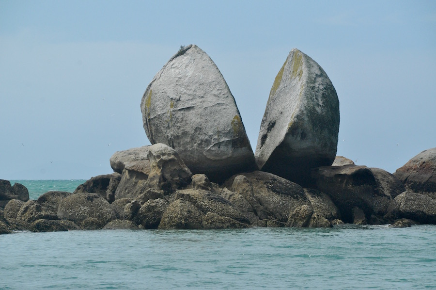 We had nothing specific planned for our stay in the Abel Tasman National Park. Whilst I was keen for the group to see and do as much as they could in the time, I was also conscious that it was an opportunity to recharge the batteries a bit. To that end, we spent our first morning relaxing on the beach and swimming at Split Apple Rock Bay. It is so named because of the large spherical boulder split cleanly in two which sits on a reef in the bay. It is a remarkable feature and it is only when you swim out to it, that you really appreciate how big it is, and how sharp the shells are that adorn the rocks at its base. Some weeks after the visit, my feet still bear the scars from trying to clamber up on to the rocks.
