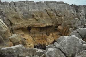 We had some distance to cover, so we did not delay and continued south to the Punakaiki Pancake Rocks. These are really best seen at high tide when there is a rough sea, so that the water is forced up through blow holes. Unfortunately, our visit coincided with low tide and there was not much of a swell. Also, it had become cloudy now that we were on the west coast, so the colours of the rocks were muted. It is another example of the diverse geological structure of New Zealand.
