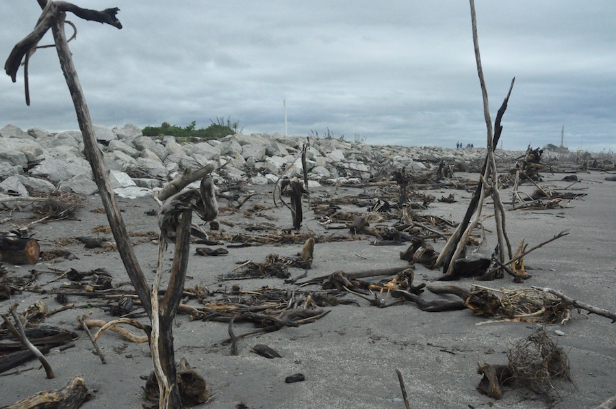 In late January, Hokitika hosts a festival of wood sculpture based on the beach, using nothing but drift wood. Everything has been stripped from the wood, all rough edges, all colour, apart from grey, it having been pounded by water and wind. Despite a few weeks since the festival there were still many makeshift sculptures along the beach, now at the mercy of the strong winds coming in from the west across the Tasman Sea. There is also a boat on the same shoreline, a memorial to the victims of rough seas, which, during the gold rush of the 1860s a ship floundered on these very shores once every ten weeks.