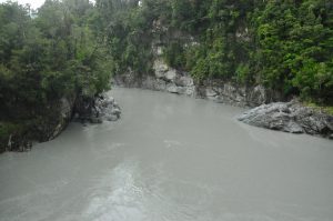 We headed inland to the beautiful Hokitika Gorge. At least, I told the group it was beautiful. I have a very clear image in my head of pristine, blue waters passing through the gorge. How disappointing to find on a grey, damp day, the waters were also grey and silty. We had taken a detour for this. At least the coffee bought from the caravan café near the carpark was good.