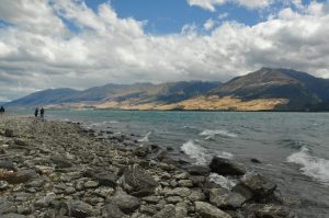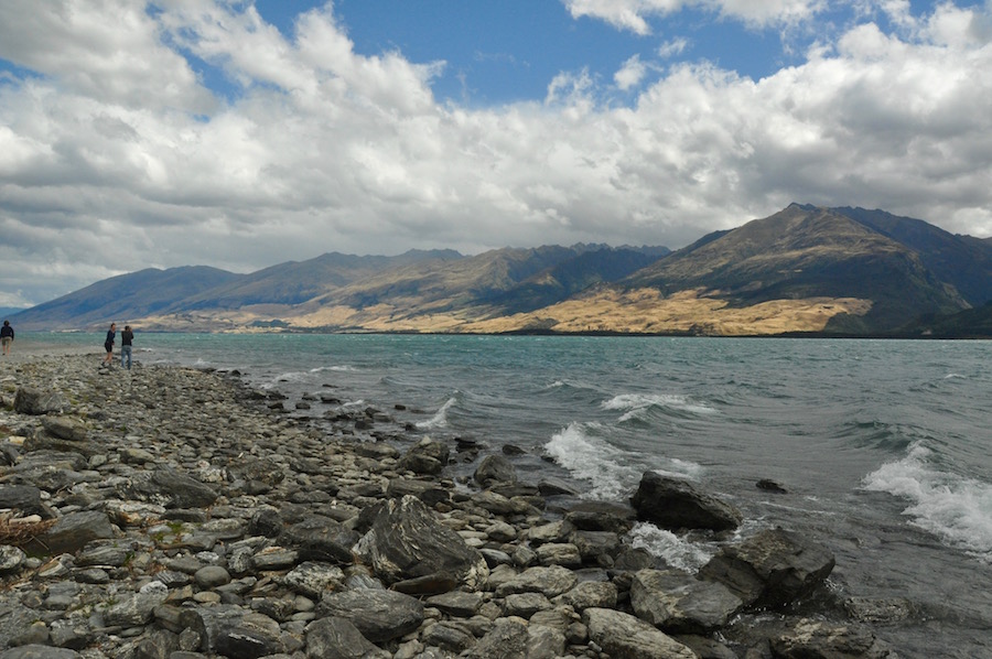 We eventually reached Lake Wanaka, a long, crooked finger of water than fills the valley for many a mile. When we stopped to appreciate its beauty, bathed in windy sunshine, we looked up towards the head of the lake and the mountains beyond where it was full of rain. Hopefully, for the next few days, at least, we could rely on some decent weather.