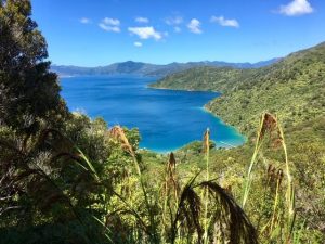 The third day of our trek was the long one from Punga Cove to The Portage, a distance of about 24km. It is affectionately known as “the big day”. To get back on to the track we had to climb up from Punga Cove to Kenepura Saddle. Fortunately, our accommodation was near the top of the resort, so we didn’t have quite so far to go. From the saddle we had views back over the trail we had covered the previous two days and views into the Kenepura Valley. The waters of Kenepura Sound were some distance down the valley so, instead of looking down on the water, we looked down on late summer farmland.
