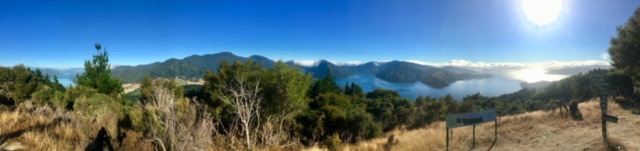 The route followed the ridge all the way round between the Queen Charlotte Sound and the Kenepura Valley. Because of the density of the forest, the views were limited. However, we came across a track leading off from the main track, climbing up to Eatwells Lookout. The path up was steep, but it was so worth the effort for the views. The sun was still fairly low in the sky and the angle created a silver sheen across the surface of the sound. It was the most perfect spot to gaze upon the beauty of the area and easily made up for all the time we had spent among the trees.