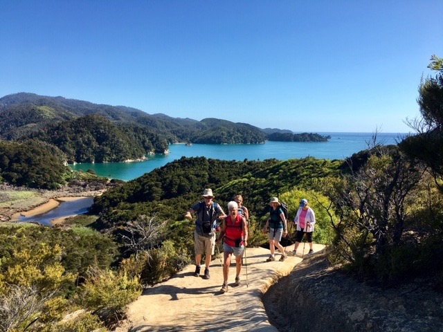 Although we were walking amongst vegetation it was much less dense than in the Marlborough Sounds and we had plenty of opportunity to gaze on the blue seas and golden beaches. At every opportunity we descended to the beach to take a closer look. Unlike many of the beaches we had experienced so far on this trip, they were not deserted. They weren’t particularly crowded either, despite it being a perfect beach day. It takes some effort to reach them, either by land or by kayak, so they are never unpleasantly busy. The golden sand is beautiful to both look at and walk on. We spent a very pleasant hour during lunch enjoying the beach at Stilwell Bay, the wading birds on the shoreline and the knowledge that we were in a most beautiful of locations.
