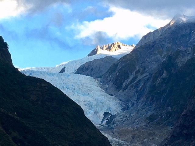 Instead we drove up to the car park and then walked up to the Franz Josef Glacier. I decided that the cloud might well clear as evening fell, and we would get, probably, the best views we could expect. Who knows what the weather would be doing in the morning? All the time, as we walked towards the glacier, clouds were lifting, revealing more and more of the upper part of the glacier. I have been here before and we were getting the best views I have had, so it turned out to be a good decision, particularly, as the next morning the clouds had returned, and the views were a little murky. Nevertheless, we still went to visit Fox Glacier in the rain.