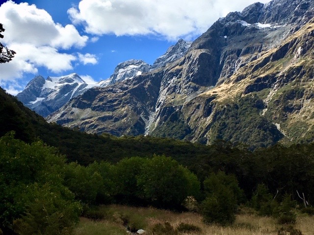 It was easy, pleasant walking through wonderful beech forests, laden with hanging mosses above a carpet of thick, verdant moss. Birdsong filled the air. Beneath us the Routeburn, a myriad of blue and green pools between white, fast-flowing sections of river. At one bridge, we paused to watch a properly equipped group, one by one, slide down a rock into a pool of foaming water. Despite dawdling, we reached the hut by early afternoon. Still with energy to spare, Mike and I went off to explore the valley opposite the hut towards some snow-capped peaks. As I was wearing flip flops, I did not expect to get far. In the end, prudence got the better of me and I turned back.