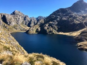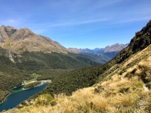 After passing Routeburn Falls Hut we emerged from the forest on to open hillside. We were still climbing but we could see the way ahead and the slight depression of Harris Saddle, the high point of the route, we were aiming for. I scanned the hillsides for kea, but as hard as I looked I could not see any. We were now walking among tussocky grass with rocky outcrops, a favourite haunt for these fascinating, yet very naughty, birds. Before reaching the saddle the path skirts high above Lake Harris.