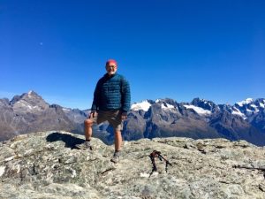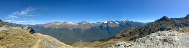 On Harris Saddle there is a shelter. It often rains in these mountains and the hut offers a little respite in such conditions. No need for respite today, but it does give you somewhere secure to leave your rucksack while you climb Conical Hill. It is only worth taking the steep climb up if you are guaranteed a good view from the top. Today was perfect and worth the effort. What a view. Completely surrounded by mountains, you look down the length of the Hollyford Valley to Lake McKerrow and beyond to Martin’s Bay and the Tasman Sea even further away. While Mike and I were climbing up there was a steady stream of people coming down, but when we got to the summit, we had it to ourselves. As we began our descent, so more people began arriving. It meant that our pictures were not polluted with other people in them.