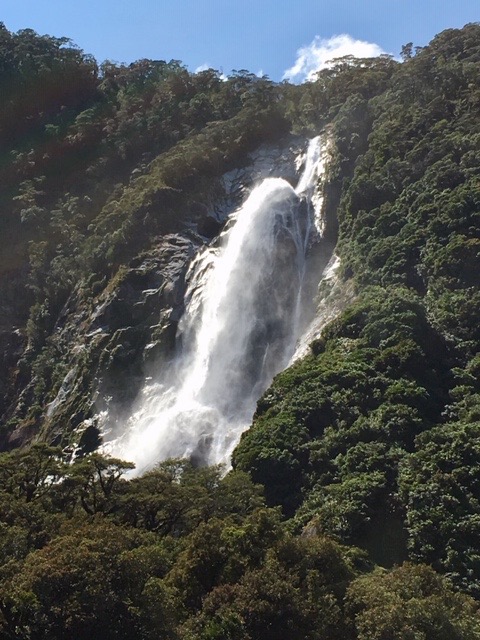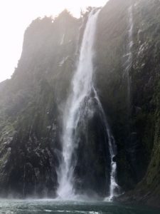 One of the favourite fall is Stirling Falls, which captains like to take their boats under. Having been warned to step inside, he nudged the boat under the full force of the fall. When I last visited Milford, it was very wet, and we did not venture quite so close. Perhaps we were benefitting from the excellent conditions. Claire mistakenly left her bag on deck and it took several days for it to dry out thoroughly.