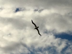 Then we went up to the viewing hide, which looks out on to the tufty grass sloping down towards the sea. Amongst the tufts, parent birds could be seen sitting with a single chick, while older juveniles were enjoying the wind, swooping and gliding. It was magical to watch. They enjoy the winds, the stronger the better.