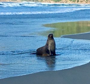 Satisfied that we had seen one, we strolled along the beach, when a female adult emerged from the sea. To begin with she rolled around on the water’s edge, in no hurry to find her young. She did not mind us being there watching her. Eventually she began to walk up the beach on front flippers but after a few steps it became too much and another roll around on the beach was what was needed. We left her to it.